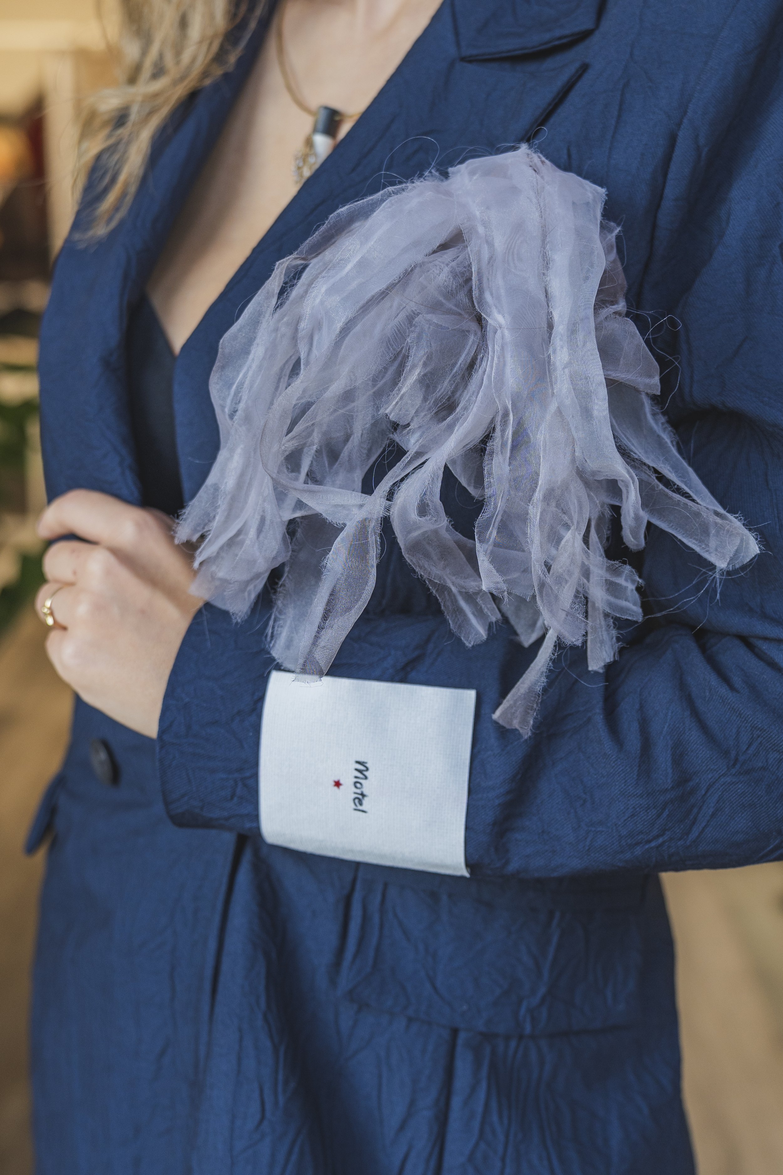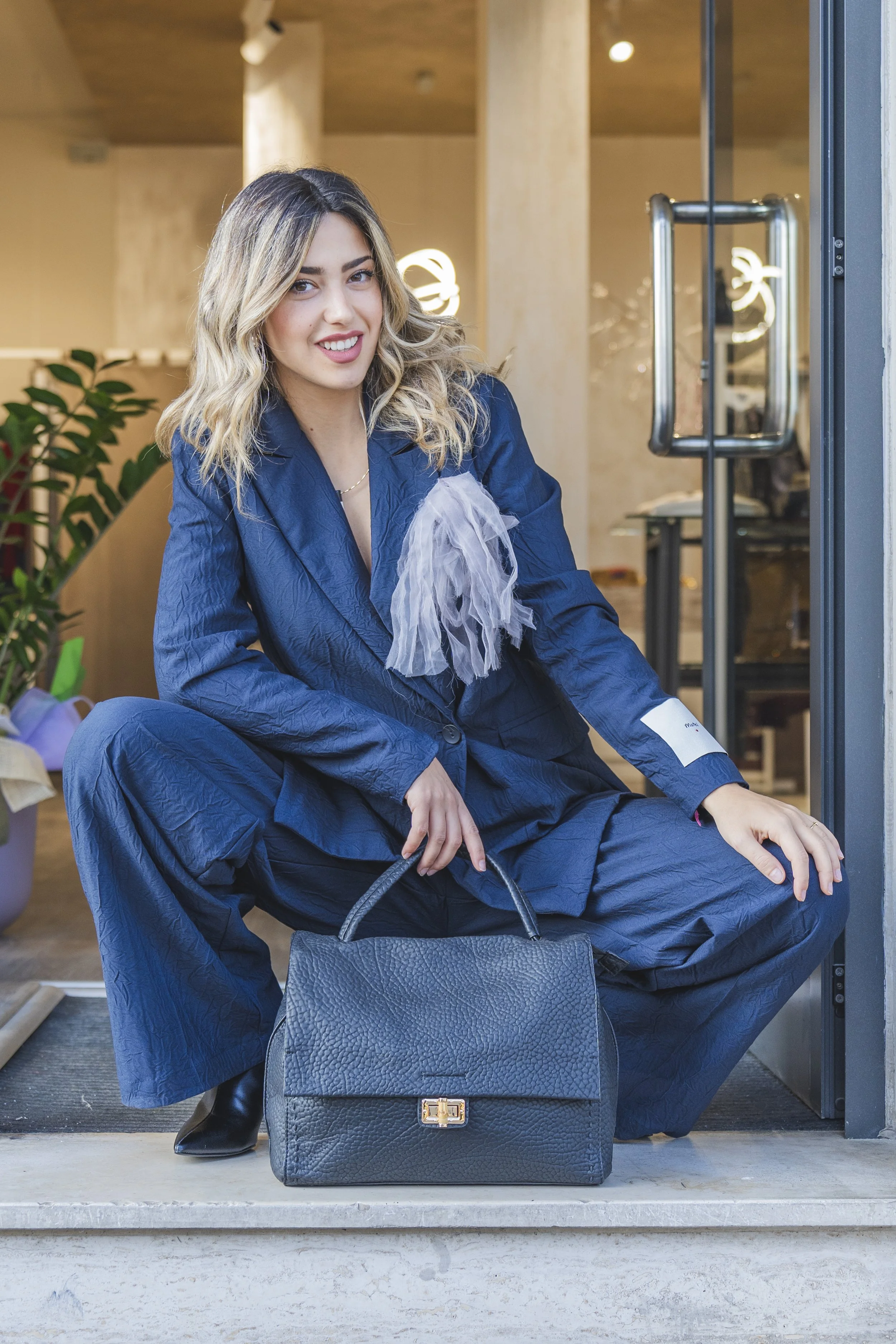 Il potere del blu incontra il design contemporaneo. Questo completo sartoriale rivisita il classico tailleur con volumi ampi e un tocco artistico dato dal dettaglio in tulle. È l’outfit perfetto per la donna che vuole comunicare professionalità senza rinunciare a una forte personalità creativa. Completato da una borsa strutturata in pelle, è la scelta ideale per passare con disinvoltura da un meeting di lavoro a un evento in città.
