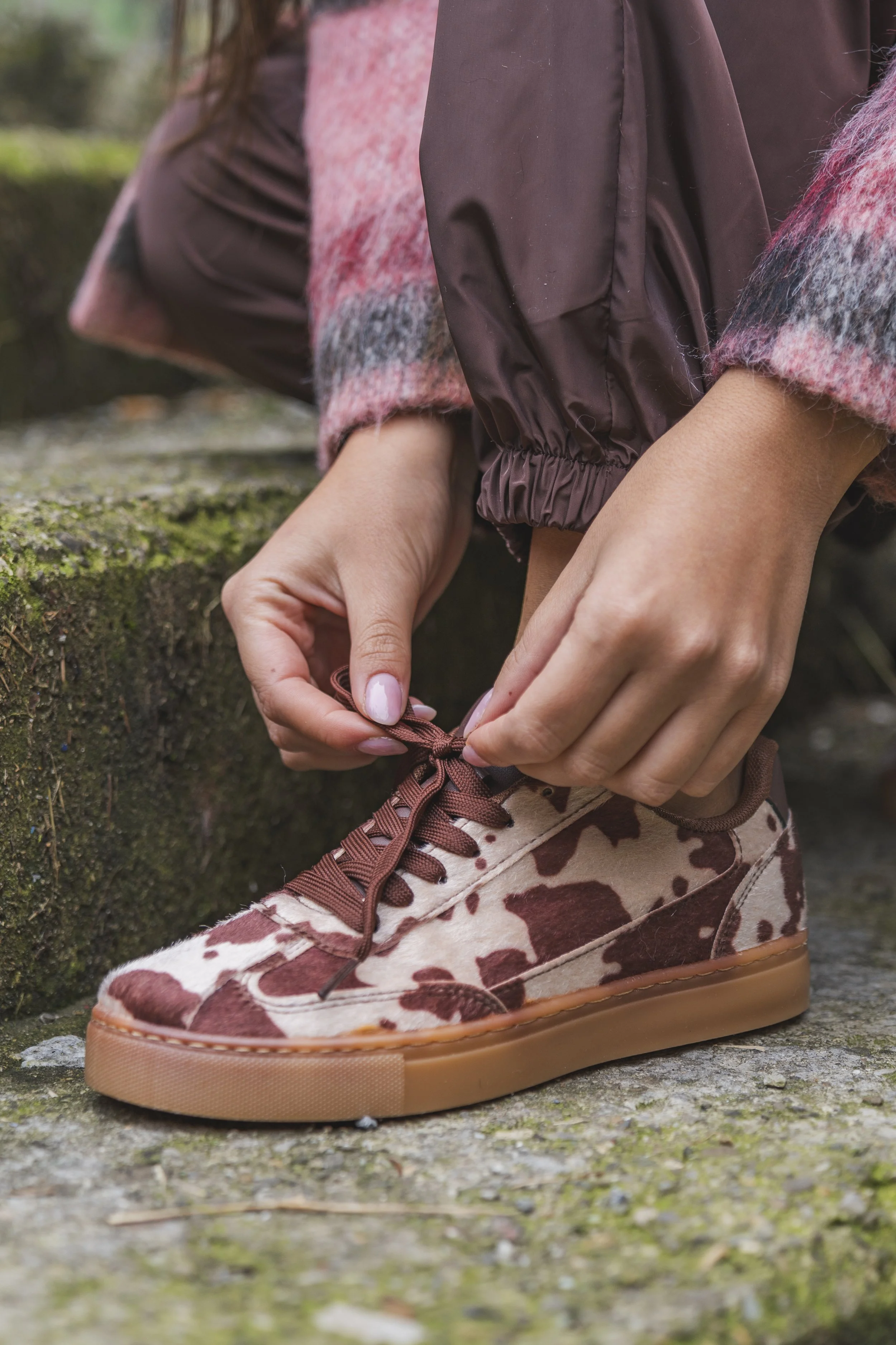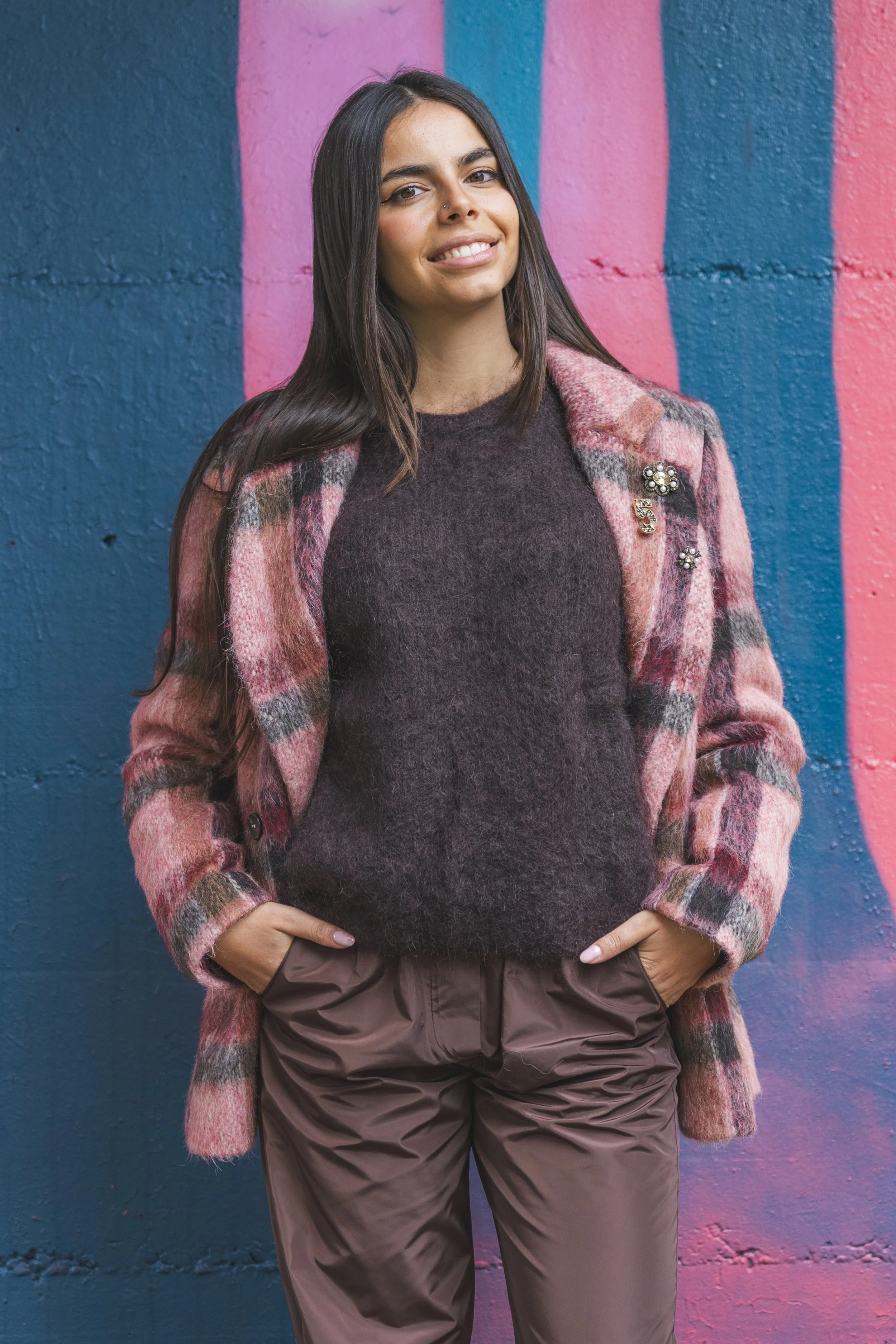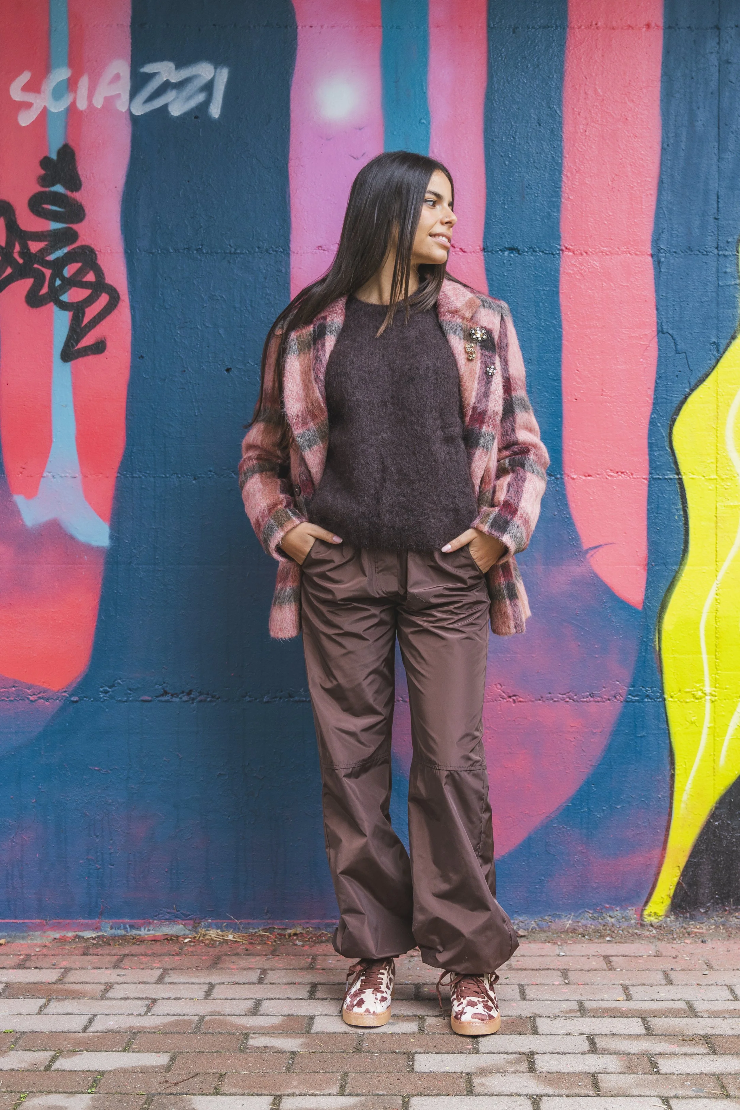 Texture accoglienti e contrasti cromatici. Questo look gioca con le sfumature del marrone e del rosa, unendo il calore di un soffice pull a un pantalone tecnico dal taglio moderno. Il cappotto a quadri aggiunge una nota vivace e geometrica, rendendo l'insieme perfetto per il tempo libero o per una giornata dinamica in città. Un mix equilibrato tra comfort assoluto e ricerca estetica per chi ama uno stile giovane e spensierato.